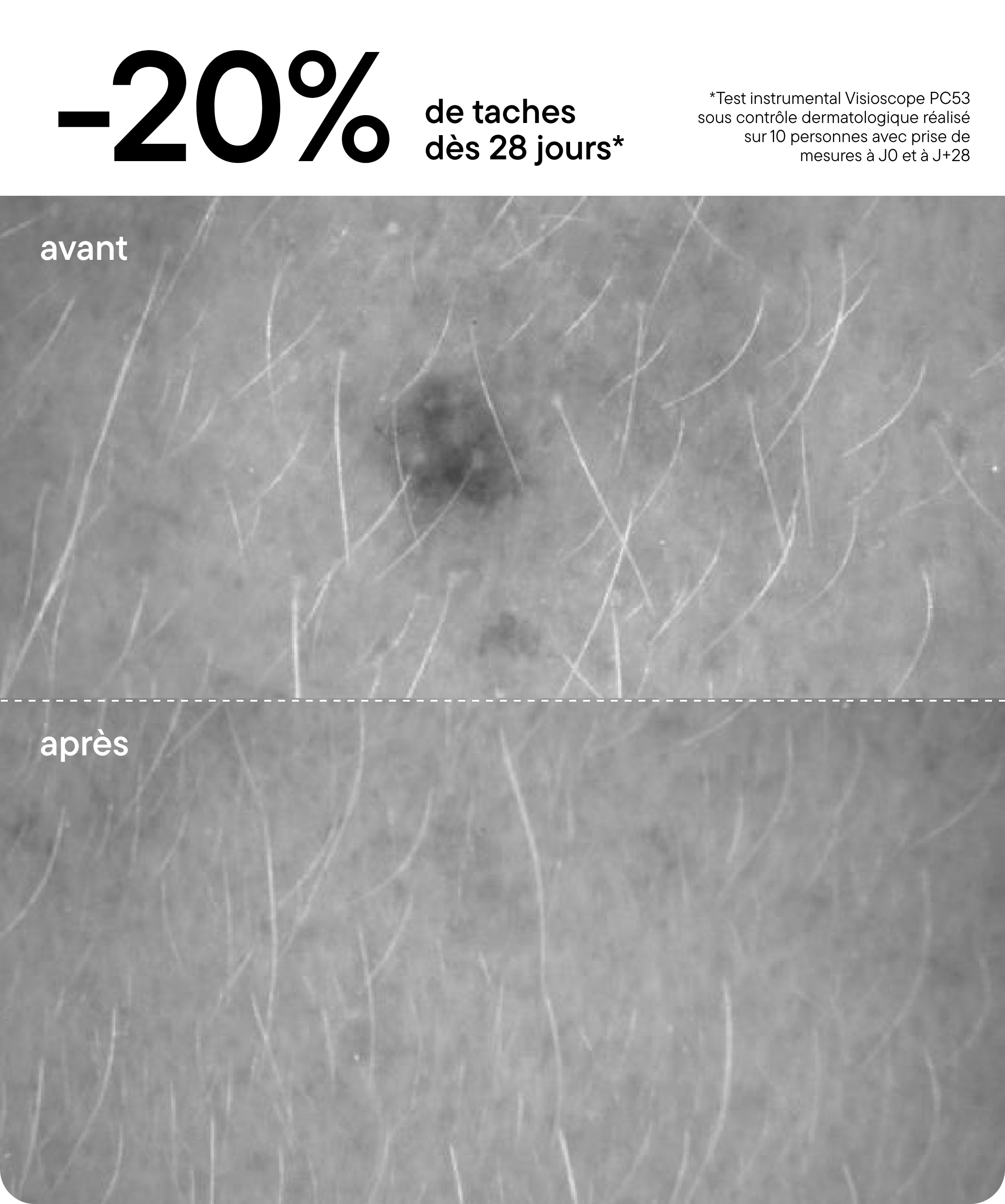 **Test instrumental Visioscope PC53 sous contrôle dermatologique réalisé sur 10 personnes avec prise de mesures à J0 et à J+28.