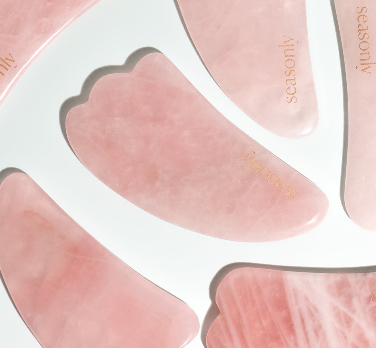 Issu de la médecine traditionnelle chinoise, le Gua Sha est un outil en pierre naturelle conçu pour « gratter » ou plutôt glisser sur la peau. Sa forme ergonomique épouse les courbes du visage et permet un massage profond. Chez Seasonly, on a repensé cet outil en Quartz Rose ou Jade pour offrir un moment de selfcare tout en activant les mécanismes cutanés essentiels : circulation, drainage et éclat.