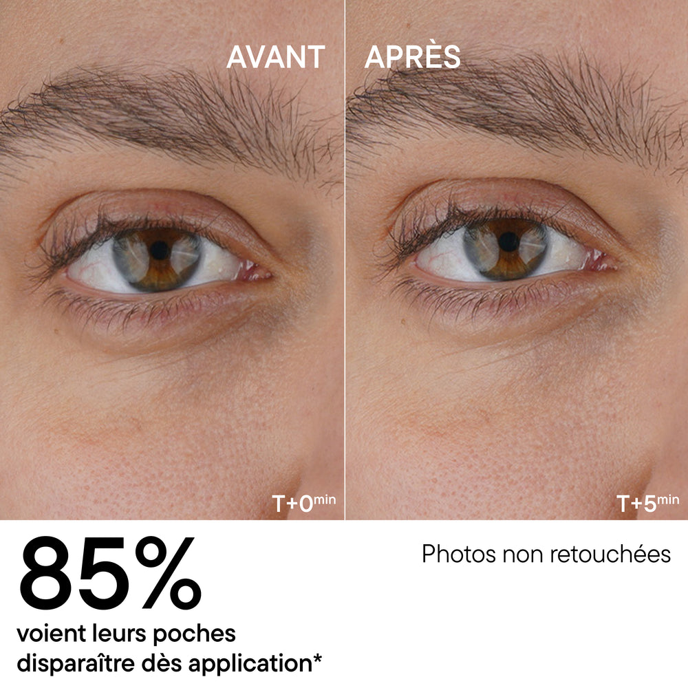 La pigmentation des cernes est réduite, les poches disparaissent, le contour de l’oeil est lissé et visiblement plus lumineux.